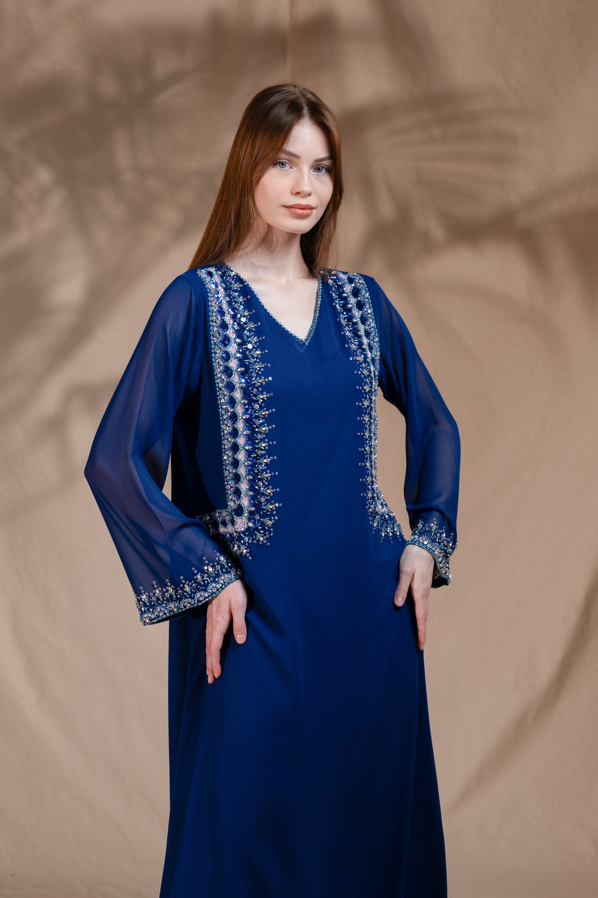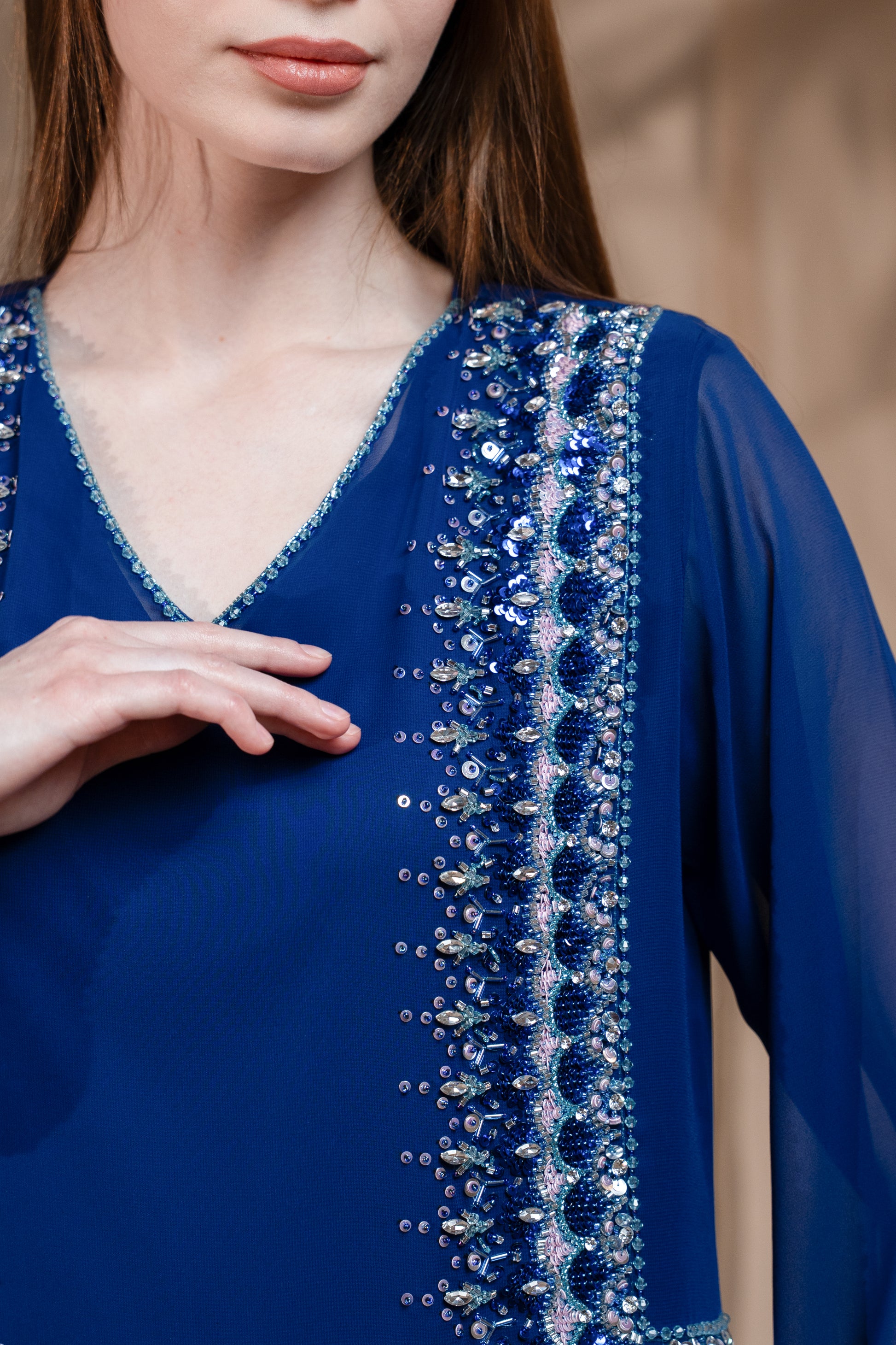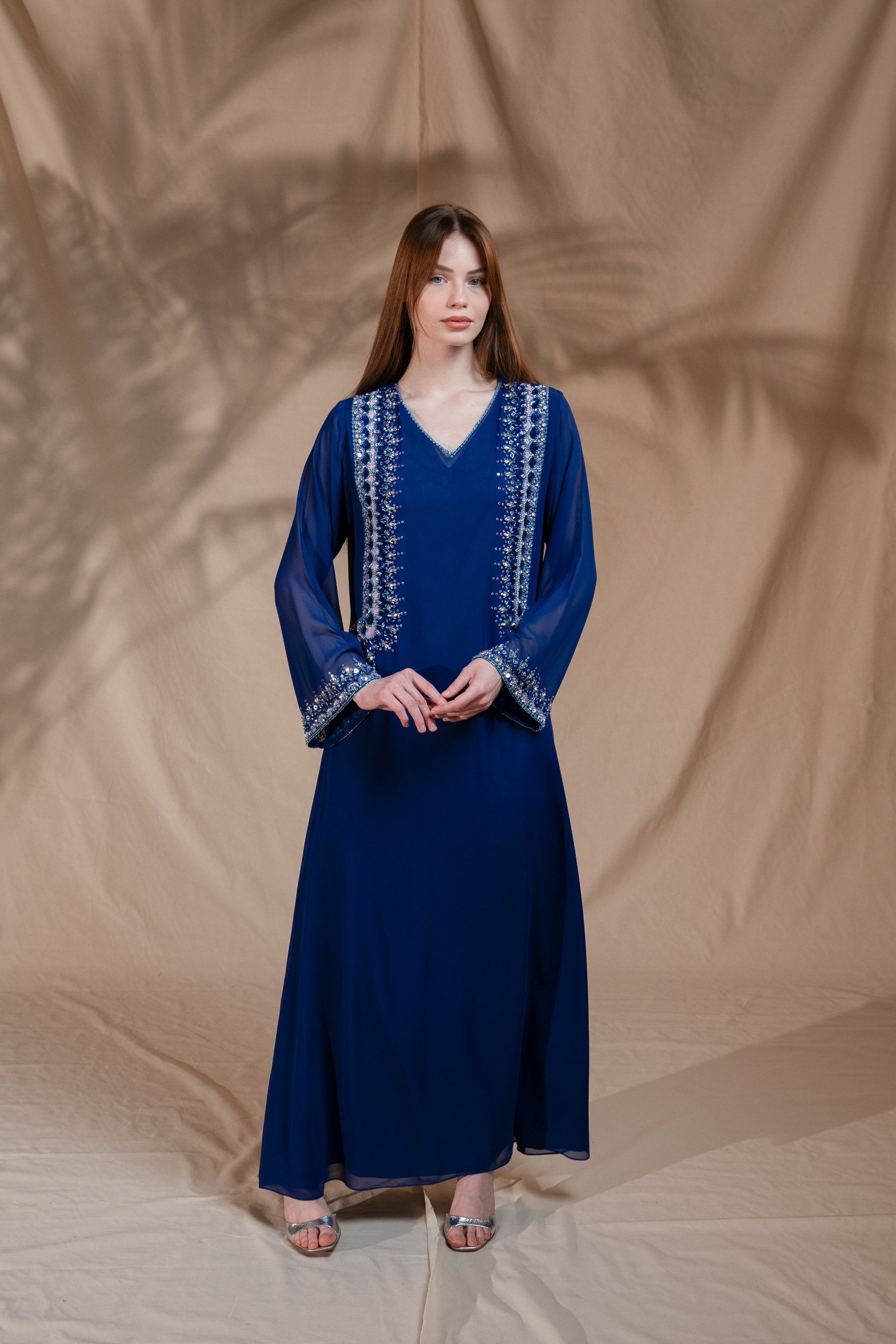 Soft flowy chiffon Ink blue wear elegant unfolds naturally handcrafted detailed work.